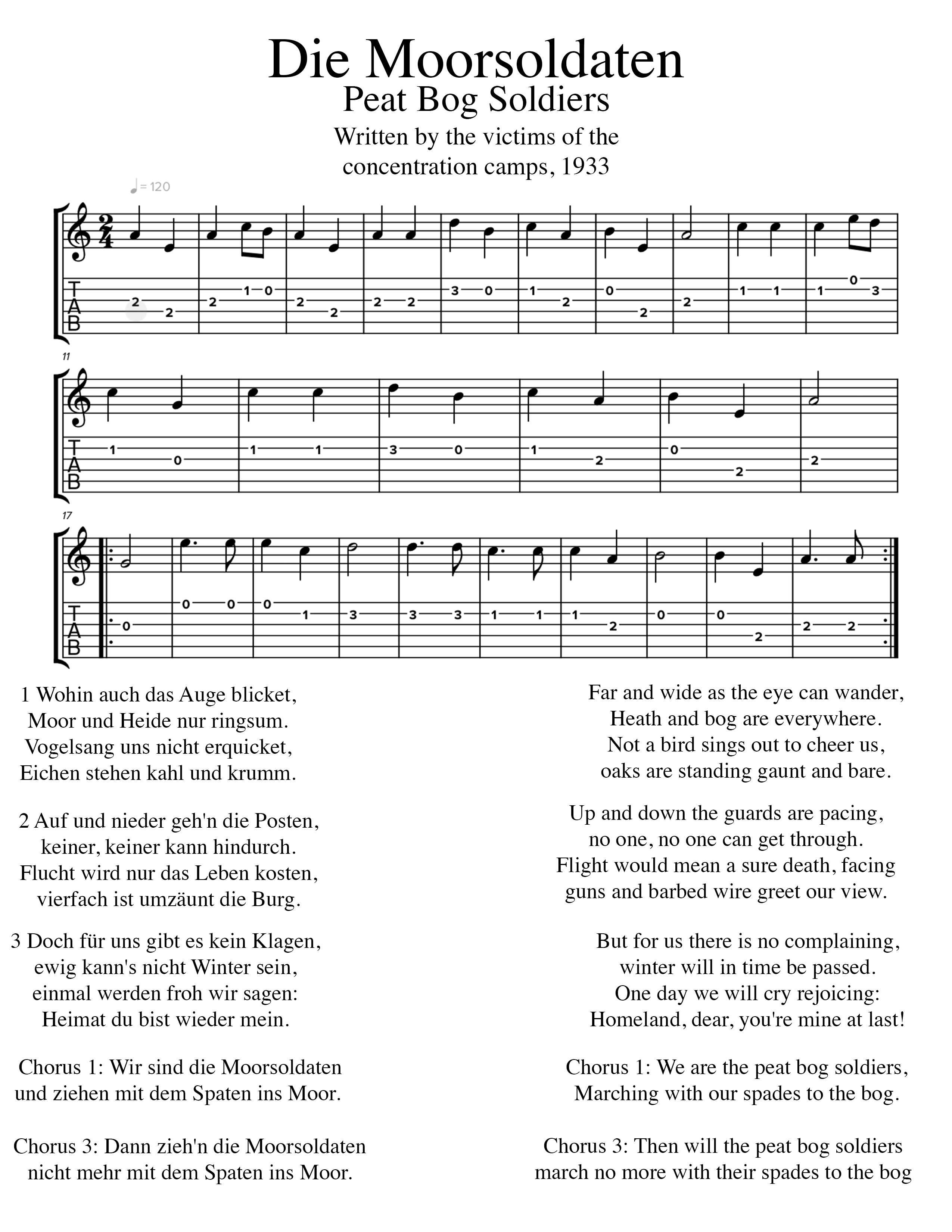 Apr 27, 2026 Die Moorsoldaten (The Peat Bog Soldiers) Guitar Tab & Lyrics A neat charting of the peat bog soldiers I made before I was good at reading sheet music. This is for standard guitar tuning, drop D is for cowards. Mario Hobbs